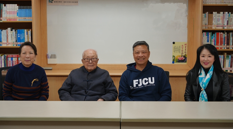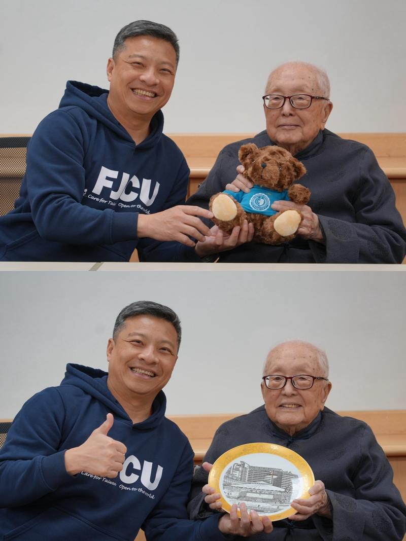 1月19日,藍易振校長親自前往拜訪高齡104歲的李育浩學長,代表學校頒贈輔大傑出校友獎狀、獎座,以及中美堂法蘭瓷紀念磁盤、百年校慶「仁和」領帶與絲巾等紀念禮品。李育浩學長在接過獎狀時,神情動容,頻頻表達對母校的感謝與感動。