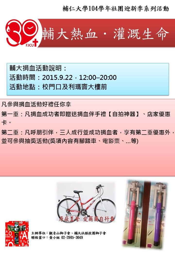 為推廣「捐血一袋、救人一命」觀念,在輔大建校90周年之際協助全體師生了解捐血救人的真諦特由「觀音山獅子會」及「輔大社服校園獅子會」聯合於輔大校園共同辦理捐血活動,讓青年學子體會個人生命的價值不僅只是自己的成就,透過服務與幫助他人更能展現生命的光輝、擴大生命格局。 誠摯邀請大家一同參與!