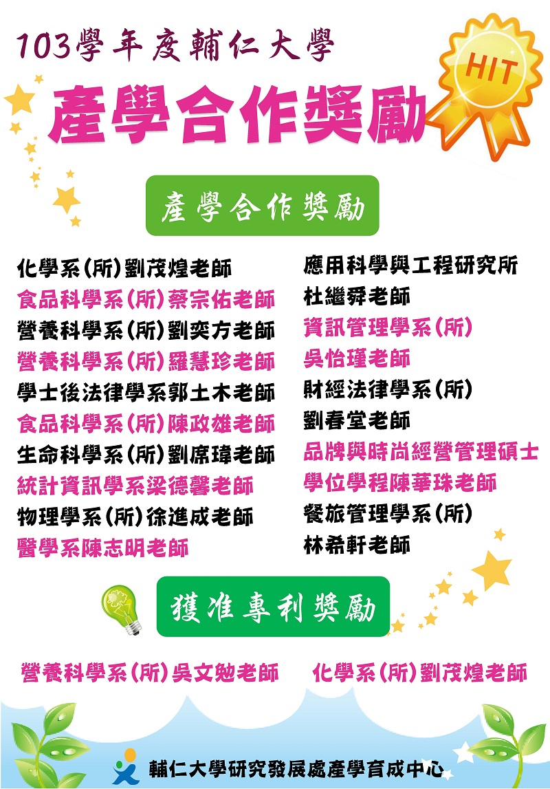 103學年度輔仁大學鼓勵產學合作獎勵名單