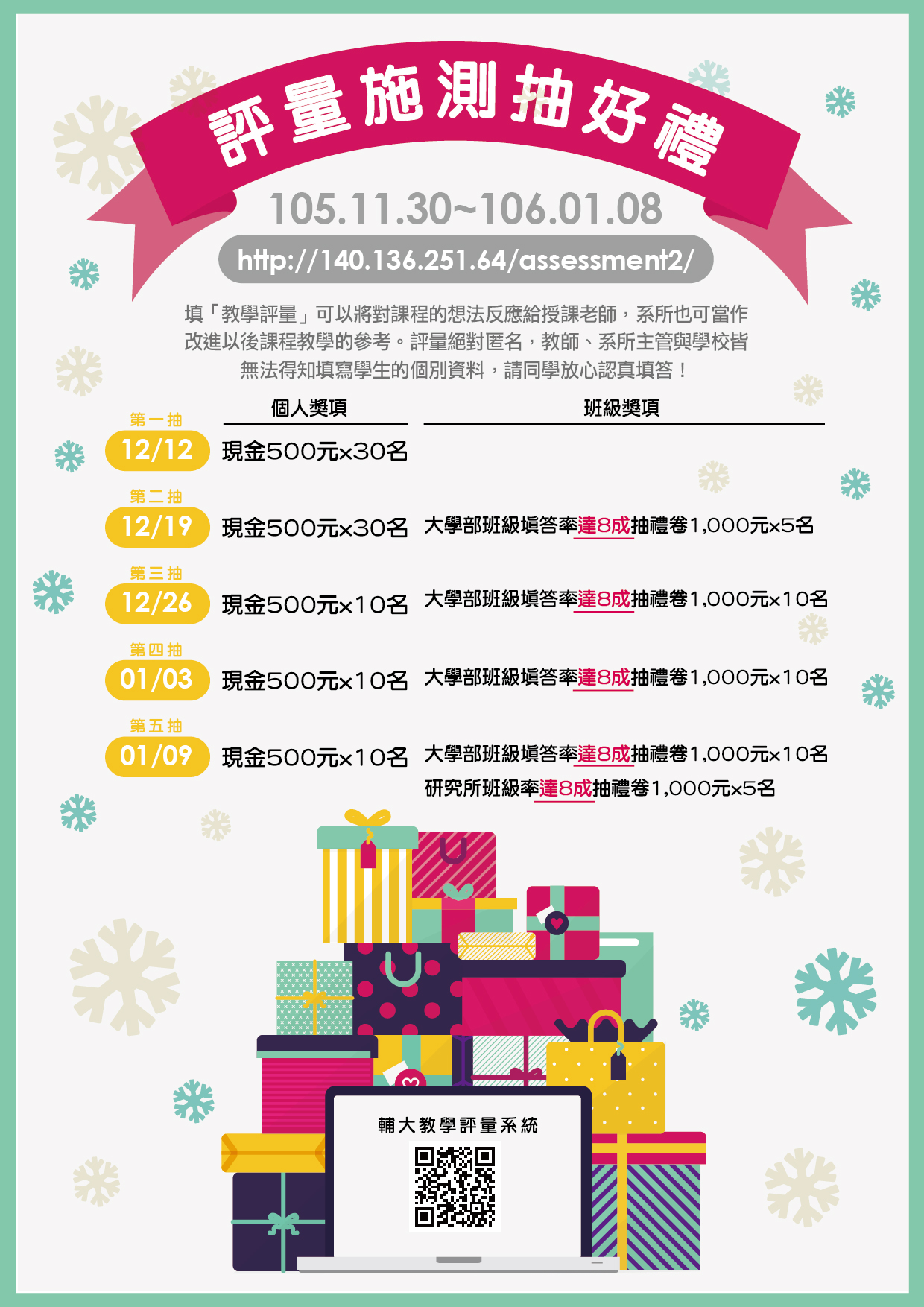 105學年度第1學期教學評量施測至106.1.8,週週好禮大方送,請同學踴躍參與評量