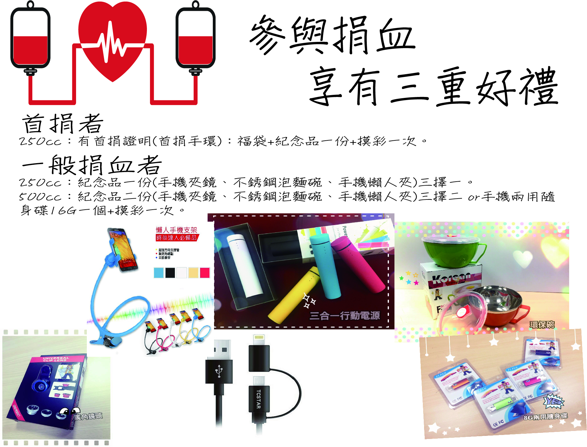 ☆首次捐血者:憑首捐證明可至兌獎區,額外兌換【捐血福袋】+【紀念品:懶人夾、手機專用三合一鏡頭、環保碗】三選一+摸彩一次(首捐只能捐一袋喔)。
