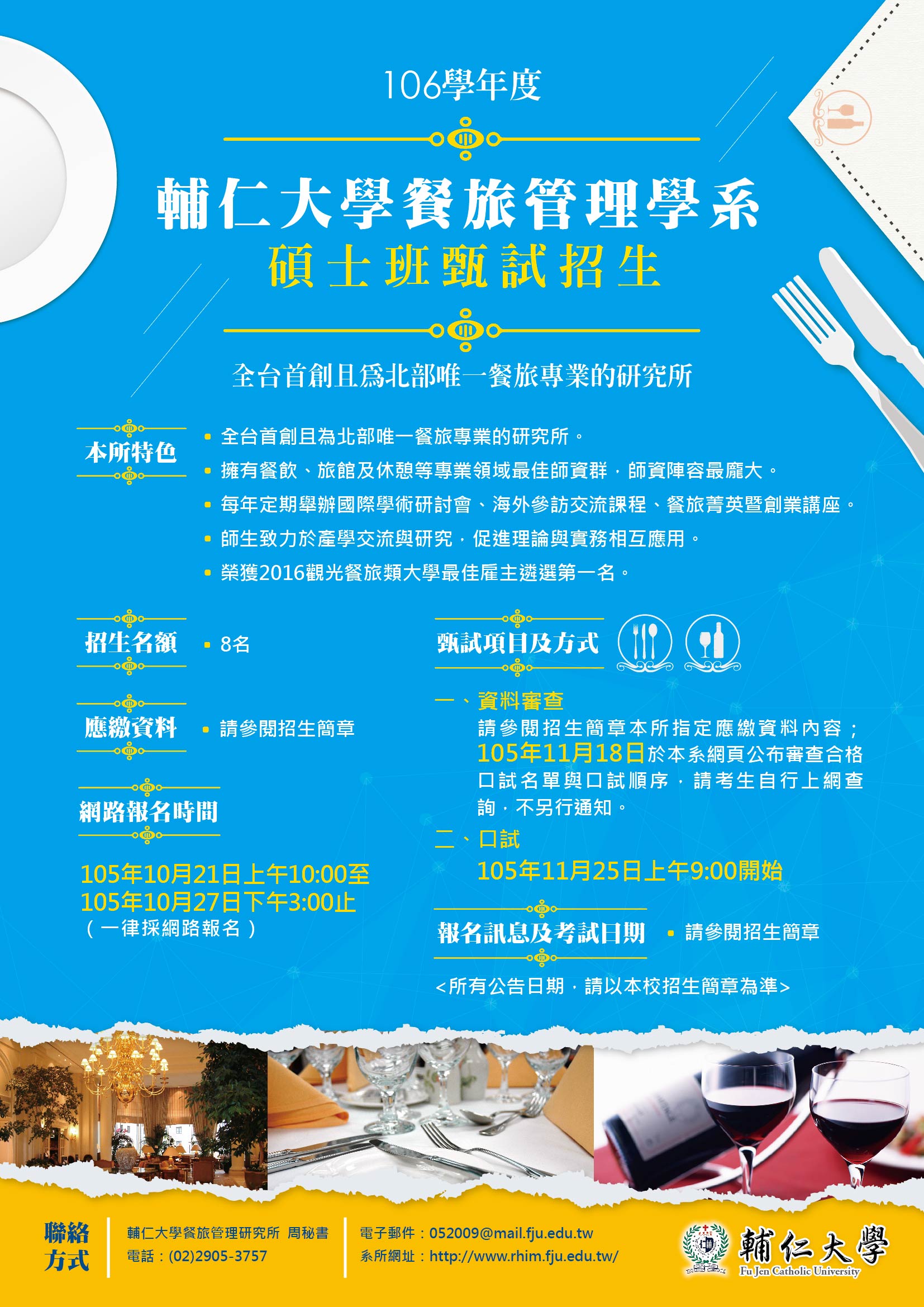 106學年度輔仁大學餐旅管理學系碩士班甄試招生訊息 ~歡迎同學踴躍報考
